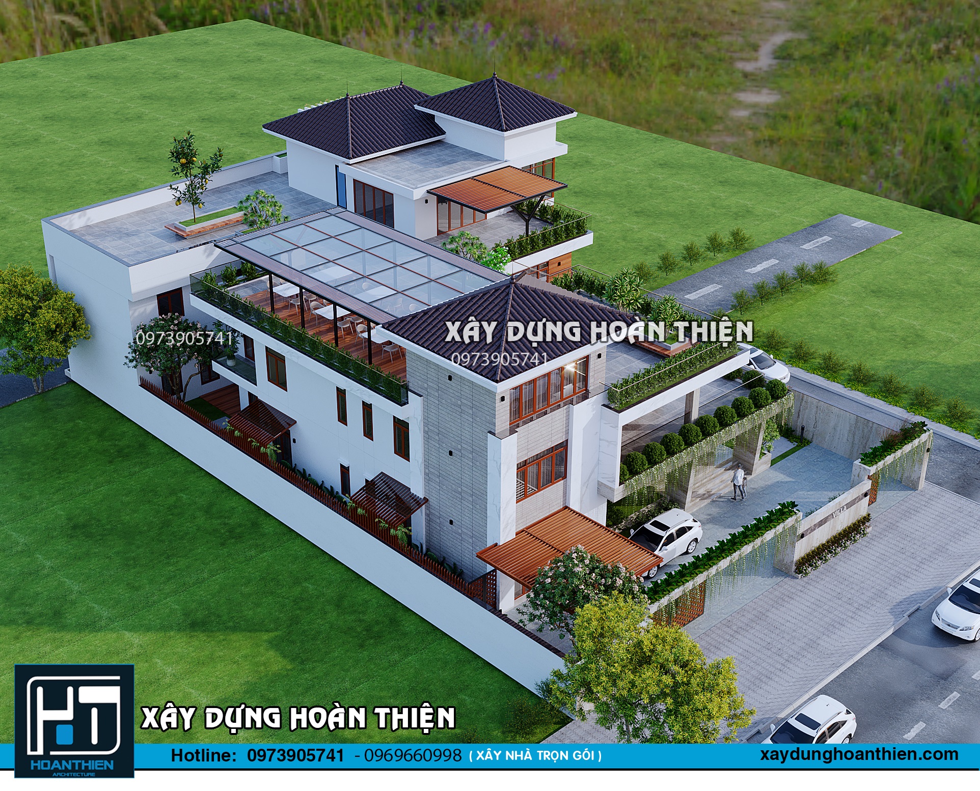- Tầng mái : phòng bếp nấu, phòng ăn trong nhà, khu vực ăn ngoài trời có mái, sân vườn trên mái